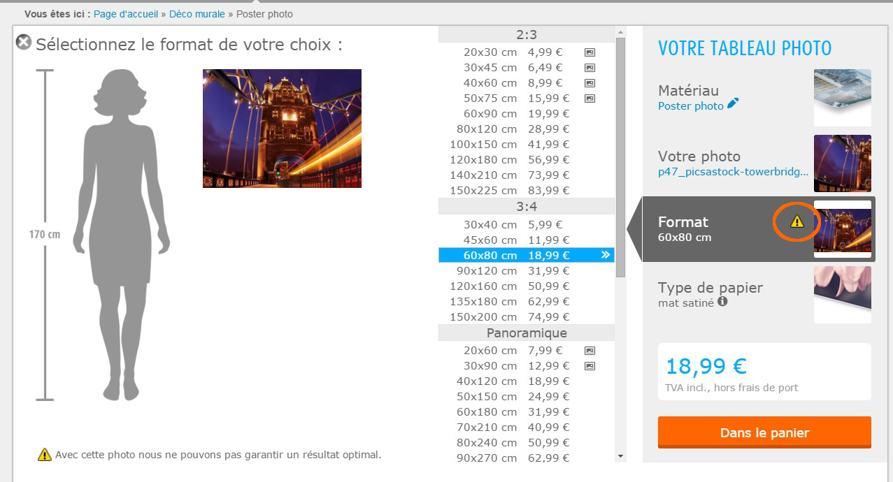 La résolution (nombre de pixel) de votre photo joue un rôle important pour réaliser votre tirage photo personnalisé de façon optimale. Si la résolution des photos sélectionnées est trop faible pour l'agrandissement souhaité, un symbole d'avertissement sous forme de point d'exclamation s'affichera.